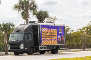 The digital mobile truck billboard set off at 12 p.m. for a six-hour cruise down Ocean Boulevard between Mar-a-Lago and The Breakers Palm Beach Resort, where it will remain throughout the gala and award ceremony and serve as a reminder of Dershowitz’s role in enabling Jeffrey Epstein’s globe-spanning sex trafficking network.